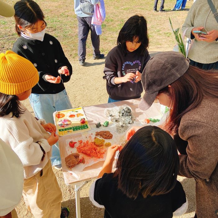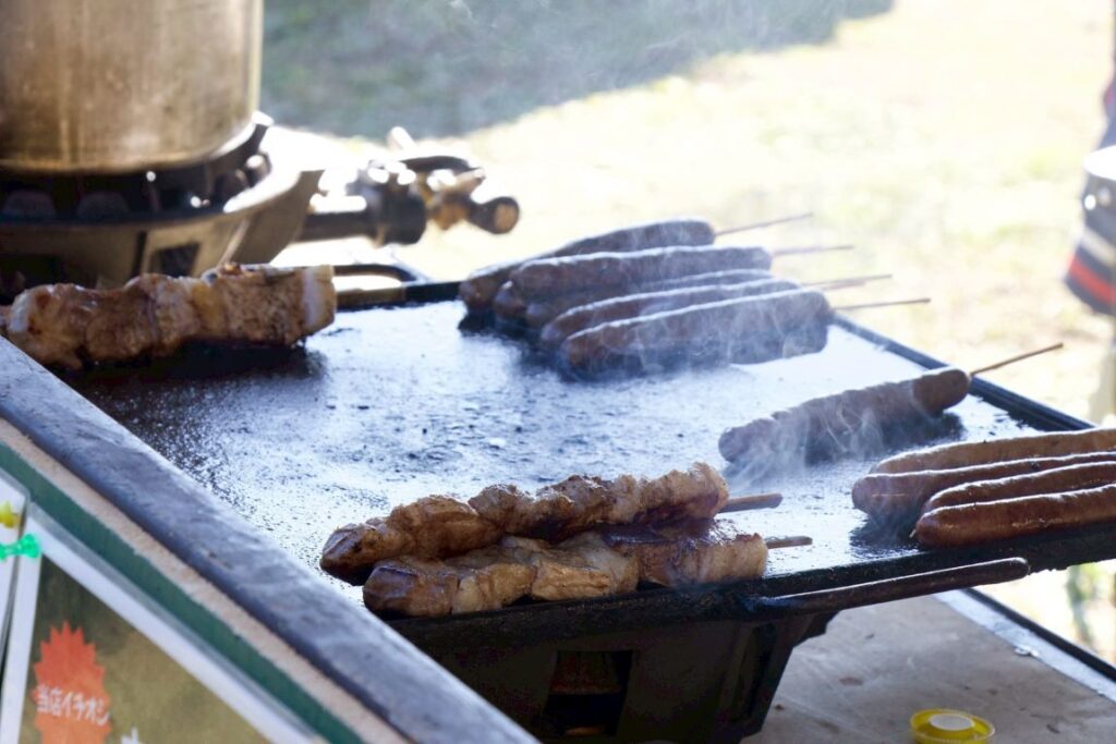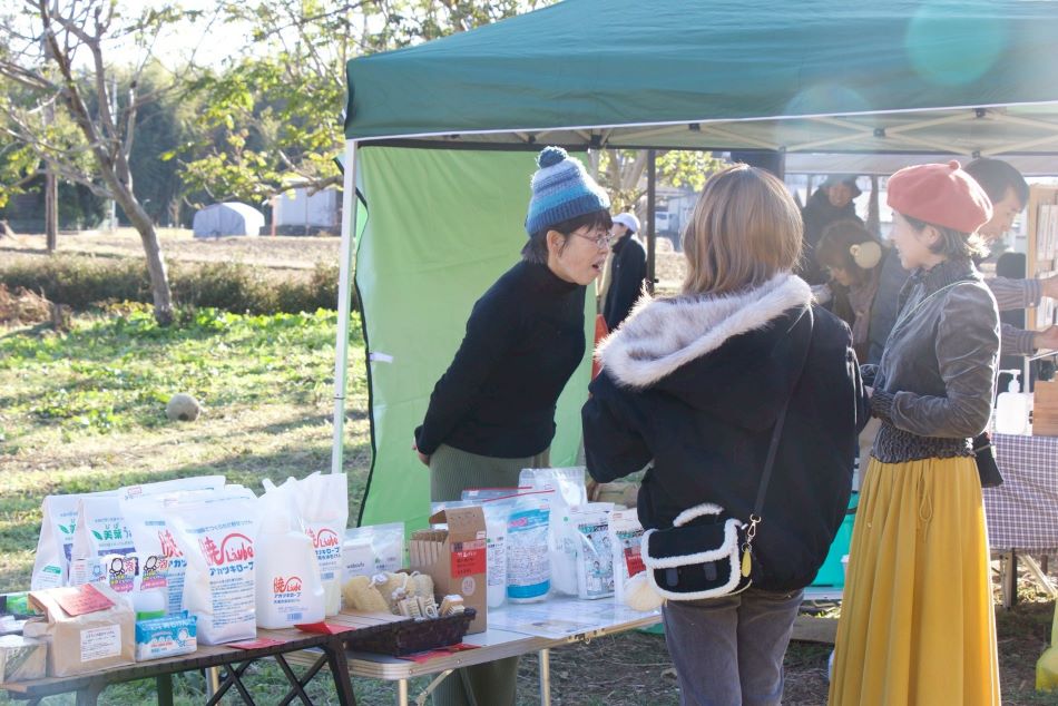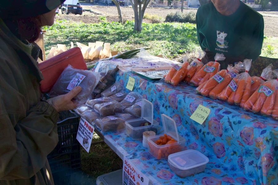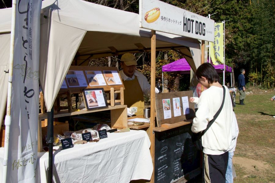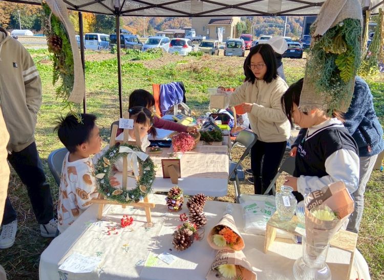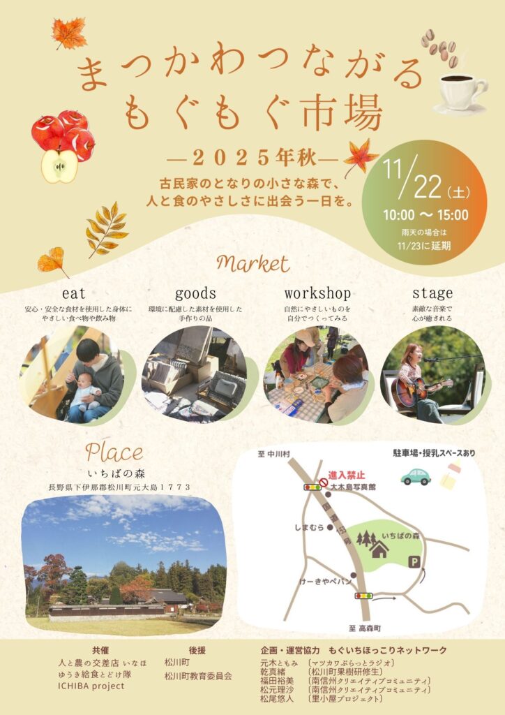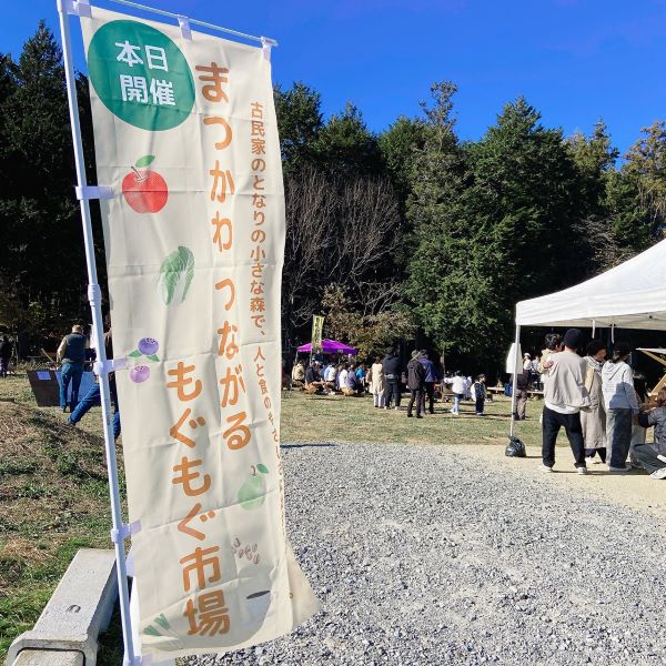 人と農の交差店いなほ の近くにある「いちばの森」で、松川町のゆうき給食とどけ隊 とICHIBA project との3者共催で『まつかわ つながる もぐもぐ市場』を春と秋に開催しています。